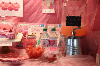 The night before, our girls put on their pinkest pajamas and laid out their pinkest outfits for the next day. I even laid out the one pink sweater I own. We of course made pink cupcakes before going to bed. Lately the girls have been helping me with the the set up, but since I am close to completing my 30 themes in 30 days, I wanted to surprise them with something elaborate. I found everything pink from every party we had ever done. It couldn't have been any pinker if I had sprayed the house down with Pepto Bismo. In addition to the pink set up, I paid a little tribute to each of the main Licious books. The Unicorn from Goldilcious, the painting easel from Purplicious, the tooth fairy from Silverlicious, the merminnie from Aqualicious, and an Emerald covered trashcan for Emerlicious.
