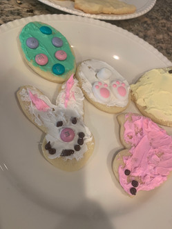 Later that evening we baked cookies using left over sugar cookie mix from Christmas. I had Easter cookie cutters that I think had only been used once. Food coloring made it easy to create several different colors for frosting. The girls loved decorating the cookies, especially the bunny backs. You can see my champagne in the background which made for a more enjoyable baking session.
